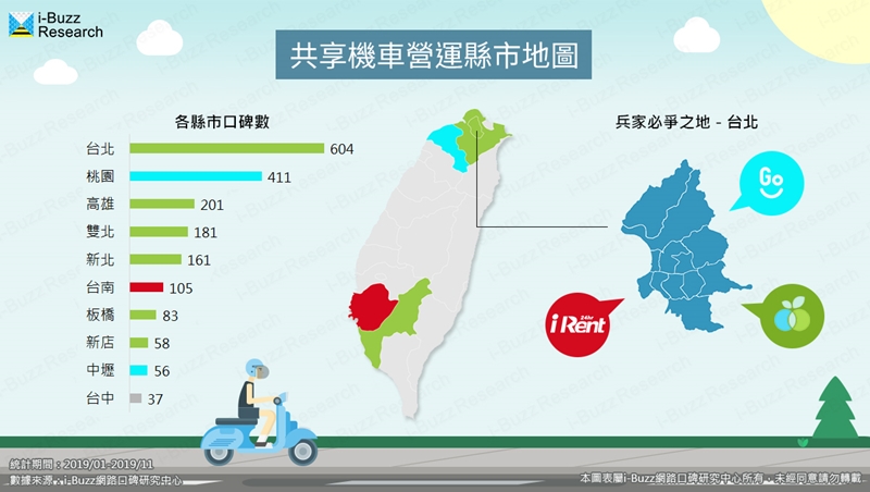而關心共享機車動向的網友們也會討論下一站在哪,擴區的消息往往會造成不小的討論,但多數希望共享機車能設在大眾交通運輸較不方便的地區,或是觀光地區,而在各個熱門縣市中,i-Buzz口碑分析技術發現,前9大熱門討論地點都已有共享機車進駐,唯有第十名的台中尚未有任何一家進駐,也許這是業者該瞄準的下一塊共享版圖。